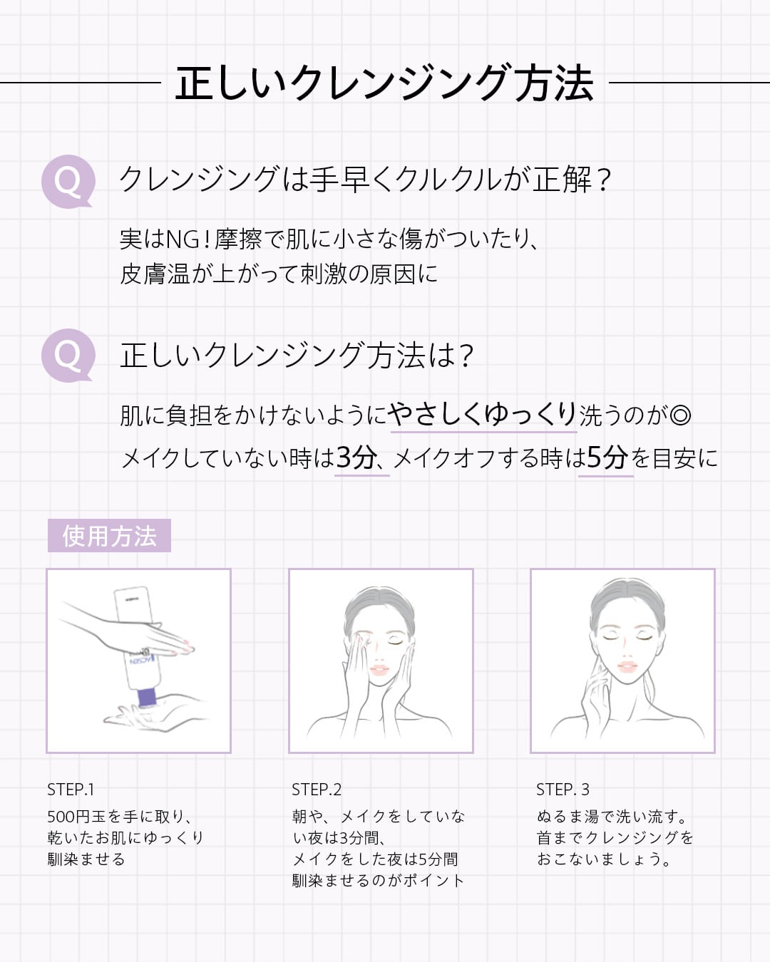 朝や、メイクをしていない夜は3分間、メイクをした夜は5分間程馴染ませるのがポイントです。