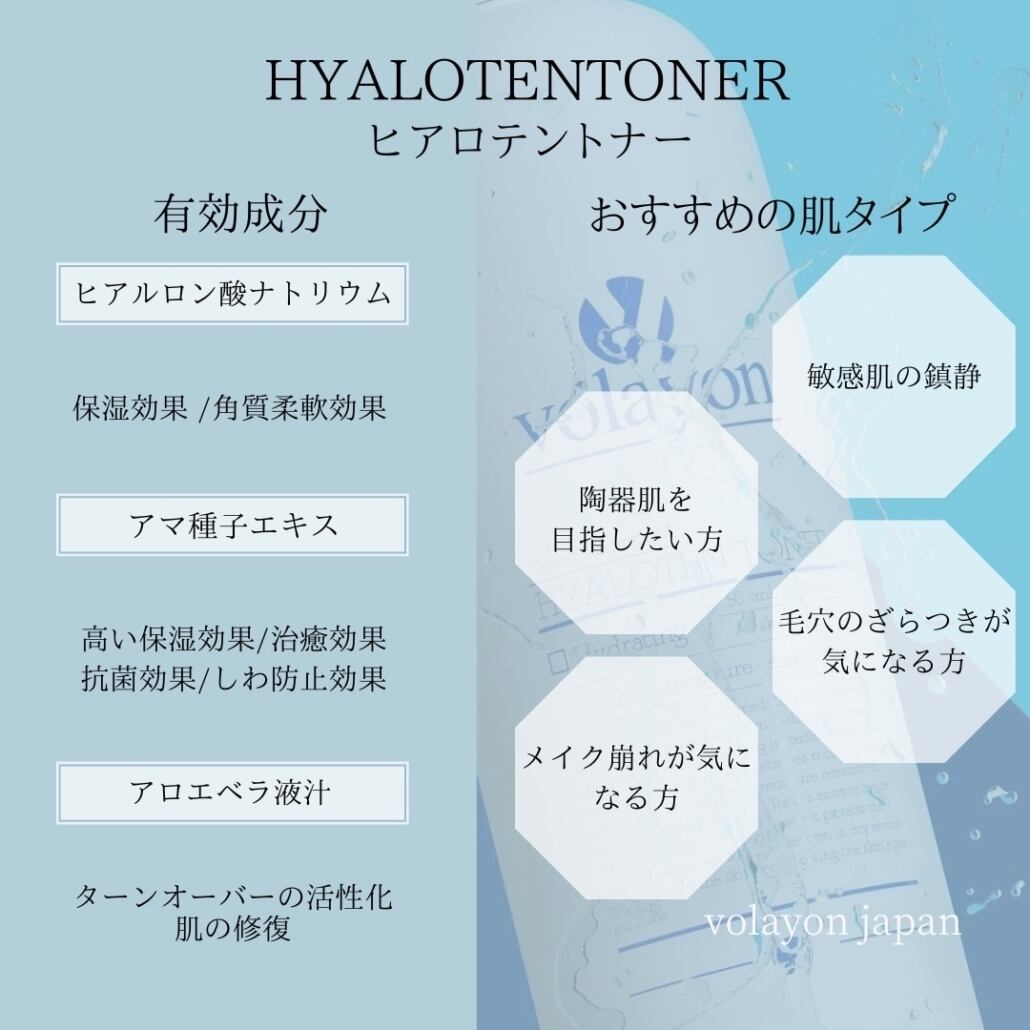 水,ヒアルロン酸Na,BG,グリセリン,ナイアシンアミド,グリセリルグルコシド,β-グルカン,セスキオレイン酸ソルビタン,ベタイン,パンテノール,エチルヘキシルグリセリン,ツボクサエキス,乳酸桿菌培養溶解質,ポリグルタミン酸,クロルフェネシン,ヒドロキシエチルセルロース,アラントイン,アデノシン,アマニ油,オクラ果実エキス,アロエベラ液汁,ゴボウ根エキス,フヨウ花エキス,タイワンツナソ葉エキス,(アクリレーツ/アクリル酸アルキル(C10-30))クロスポリマー,PEG-60水添ヒマシ油,EDTA-2Na,香料,黄4,青1